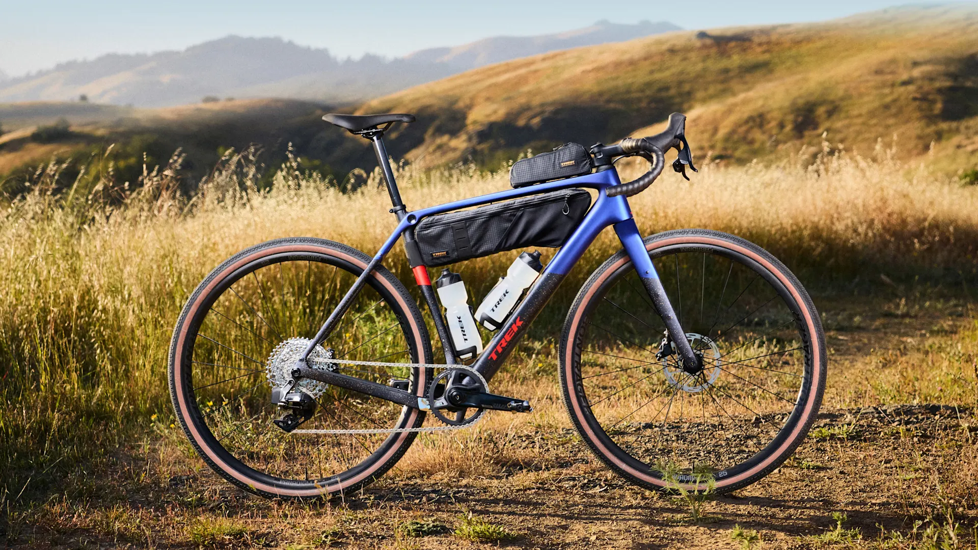 A 500 Series OCLV Carbon frame with a carbon fork, internal downtube storage, frame and fork mounts, and clearance for 50 mm tyres (as measured). A 12-speed 1x SRAM Apex XPLR AXS fully wireless drivetrain, hydraulic disc brakes, carbon seat post, and Tubeless Ready Bontrager Paradigm SL wheels with 42 mm tyres.
