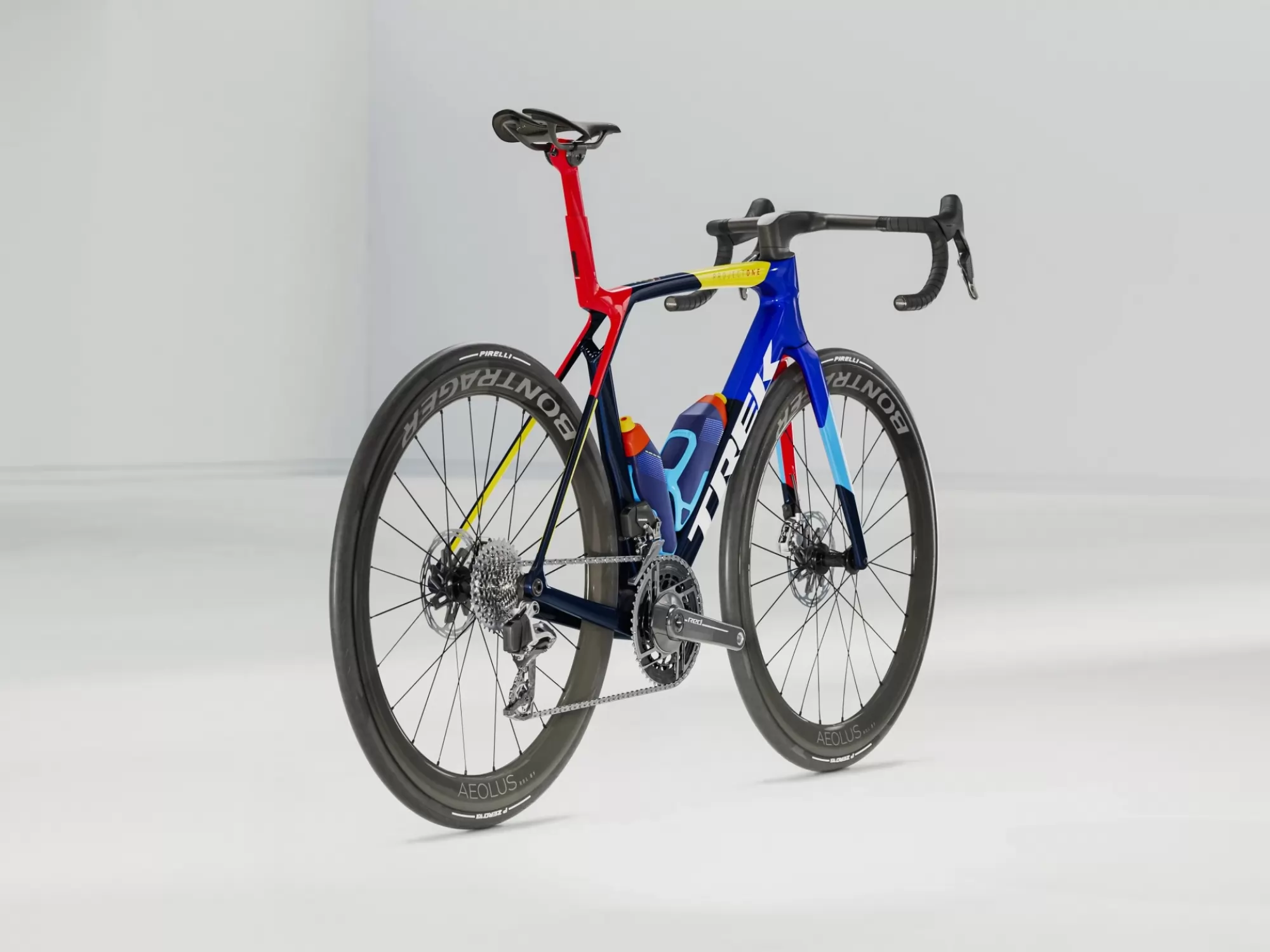 An insanely light frame made of our highest-level 900 Series OCLV Carbon with aero tubing, IsoFlow comfort technology and RSL Aero Bottles and Cages that save watts. SRAM's latest RED AXS E1 ultra-light drivetrain and power meter for training with data. A universal derailleur hanger so you can get a replacement from anywhere. Plus, it's topped off with Bontrager Aeolus RSL 51 tubeless carbon wheels and a Trek Aero RSL one-piece bar/stem.