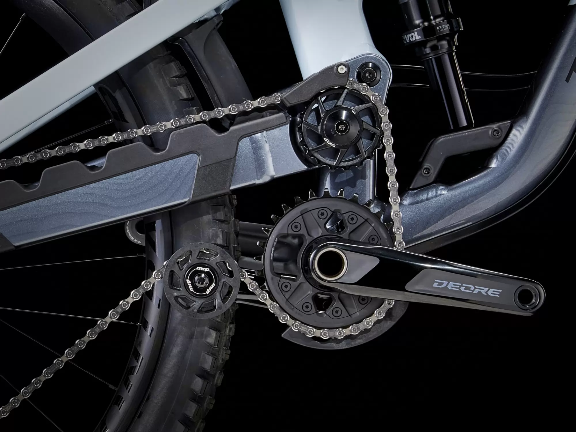 The lower idler pulley prevents chain growth below the chainstay and keeps that tension off the derailleur cage so you get better shifting and suspension performance.