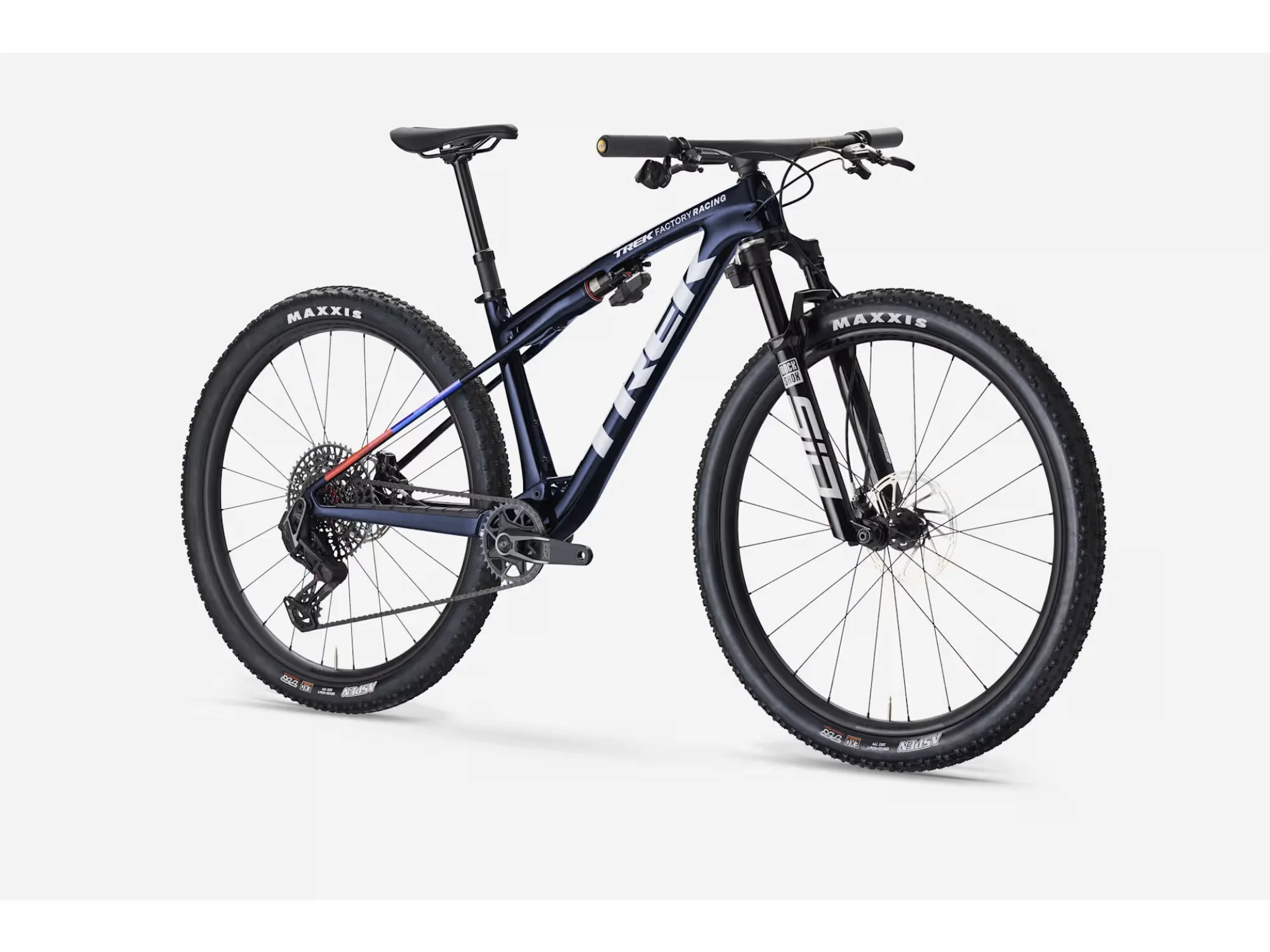 A featherweight, high-modulus SLR OCLV Mountain Carbon frame with modern XC geometry. 110 mm of front suspension from a RockShox SID SL Ultimate fork with DebonAir spring and Flight Attendant Race Day DAMPER and 80 mm of IsoStrut rear suspension from a RockShox SIDLuxe shock – all with Flight Attendant. A fully wireless SRAM X0 AXS 12-speed electronic transmission, Bontrager Kovee Elite 30 carbon wheels, carbon Bontrager RSL Integrated bar/stem combo, Bontrager Line dropper post and SRAM Motive Silver 4-piston hydraulic disc brakes.
